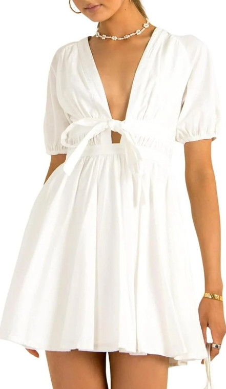 Women's Cute Summer Short Puff Sleeve Tie Cotton Mini Dress Size Medium Great Deals and Steal