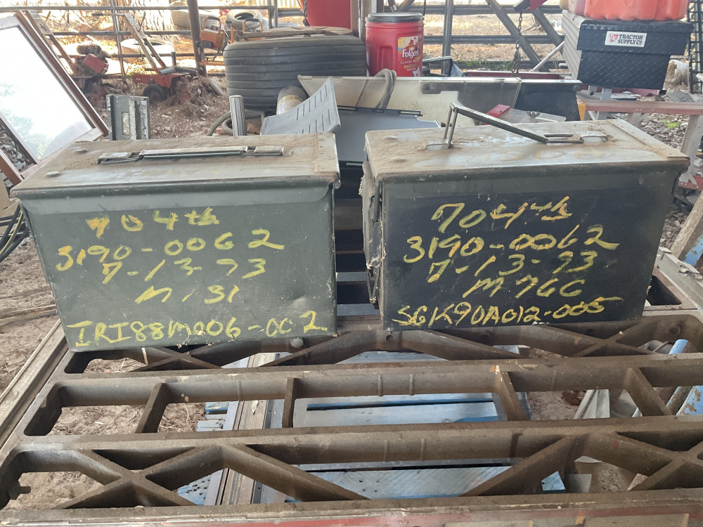 Two army ammo cans, manu markings unreadable. Both marked 704th. Same size as .50 cal cans. Excellent condition.