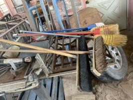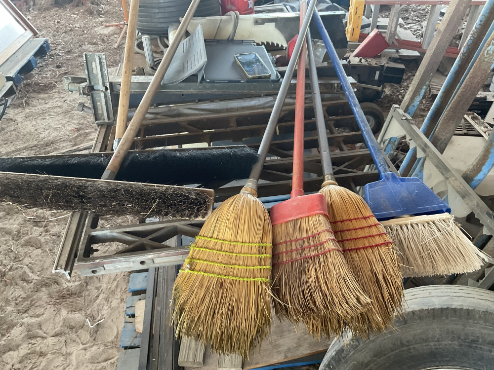 3 straw bristle brooms, 1 nylon bristle broom, 2 shop style push brooms