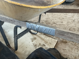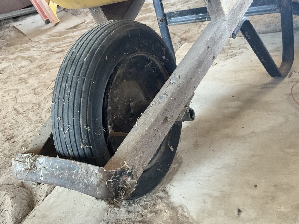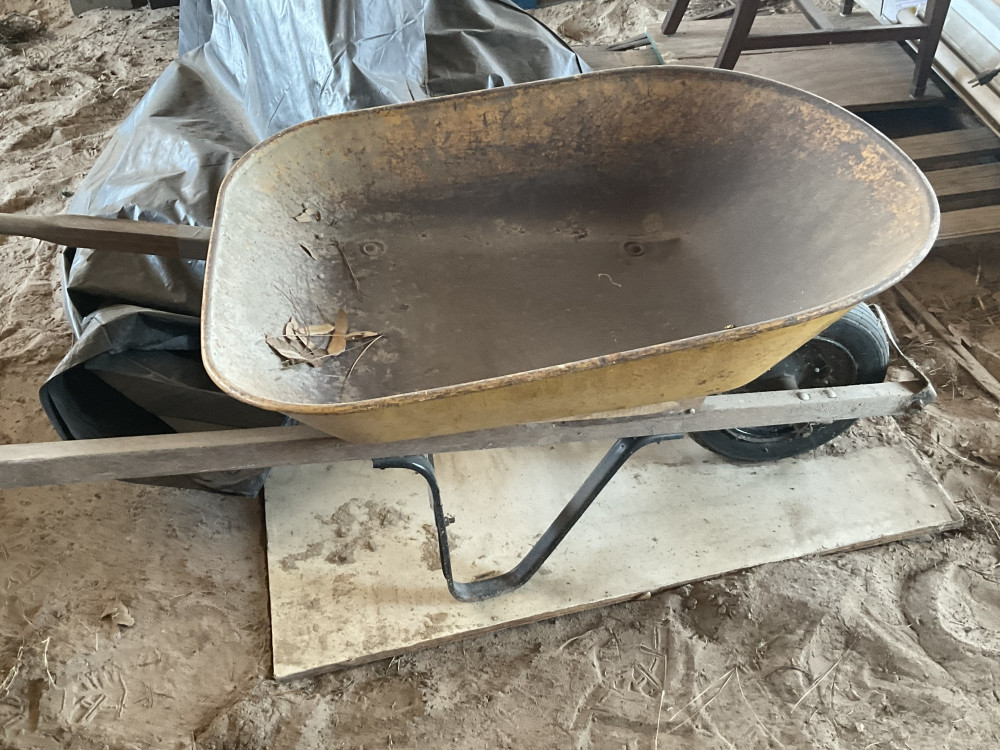Yellow wheelbarrow, 1 handle has been repaired and seems very strong. Pneumatic tire currently flat, condition unknown