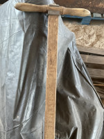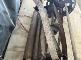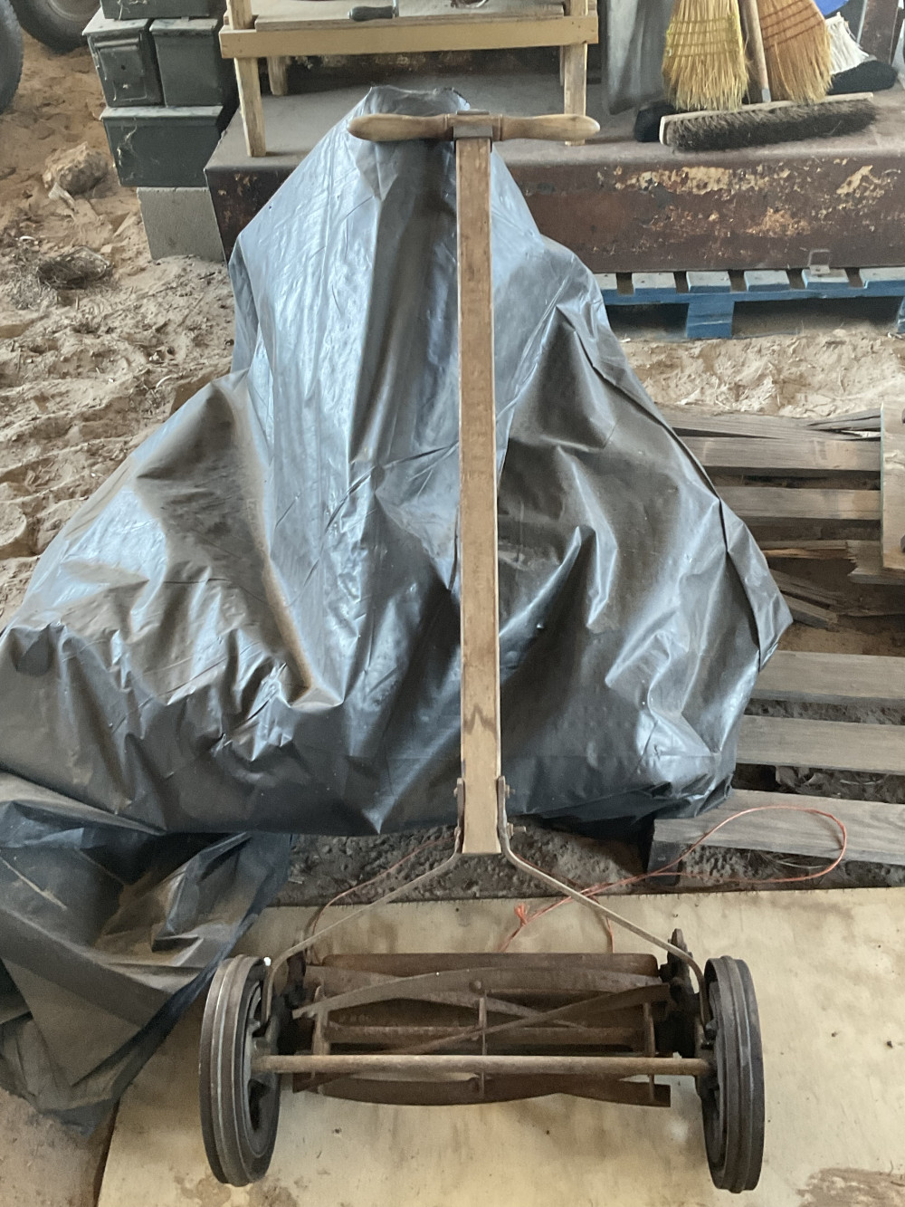 Westline Superior brand reel mower, solid wooden shaft and handle, solid rubber tires have rotted off and will have to be replaced.