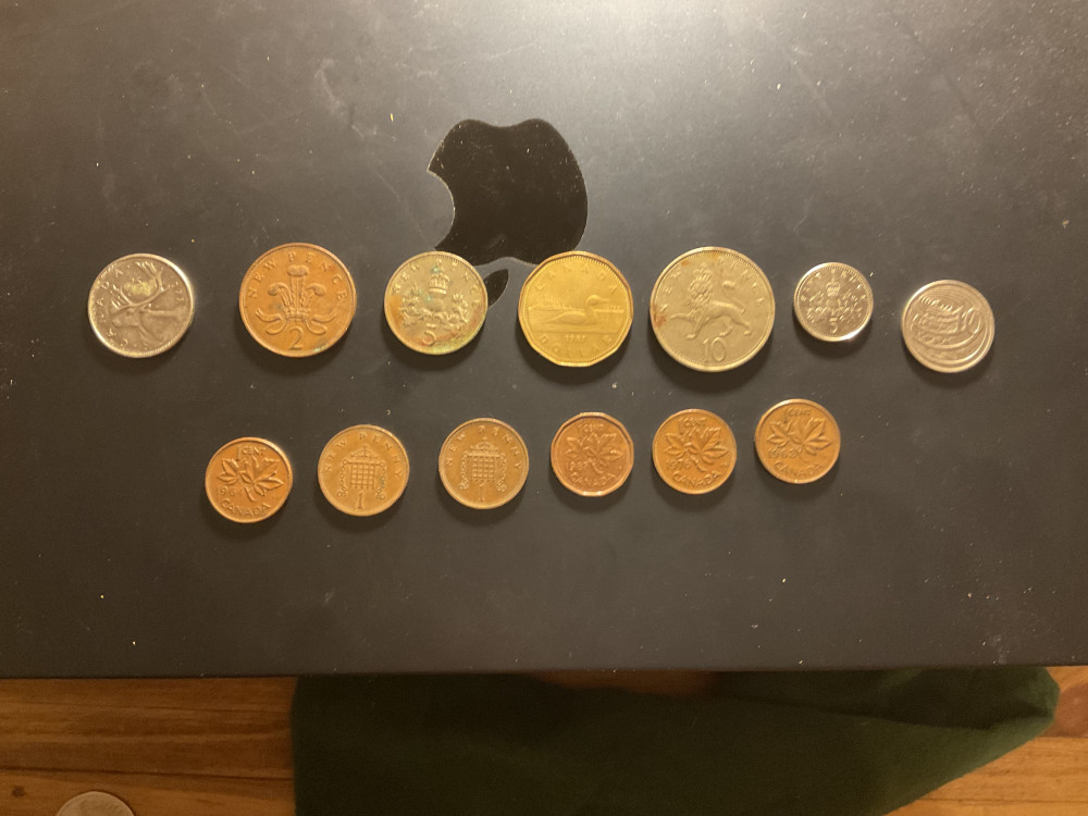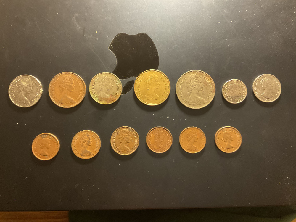 Thirteen Canadian coins, various denominations from 60s, 70s, and 80s, and one 1990.