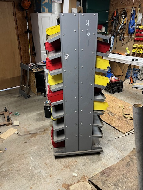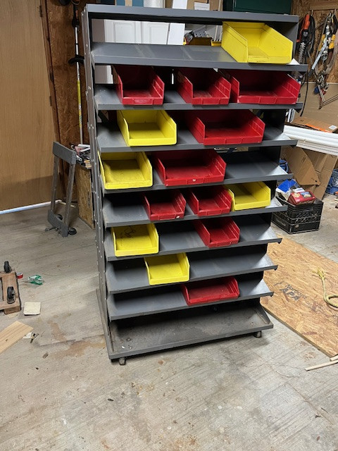Nice rolling parts shelf. Shelf includes 40 plastic part bens. All are in good shape, need a little cleaning.