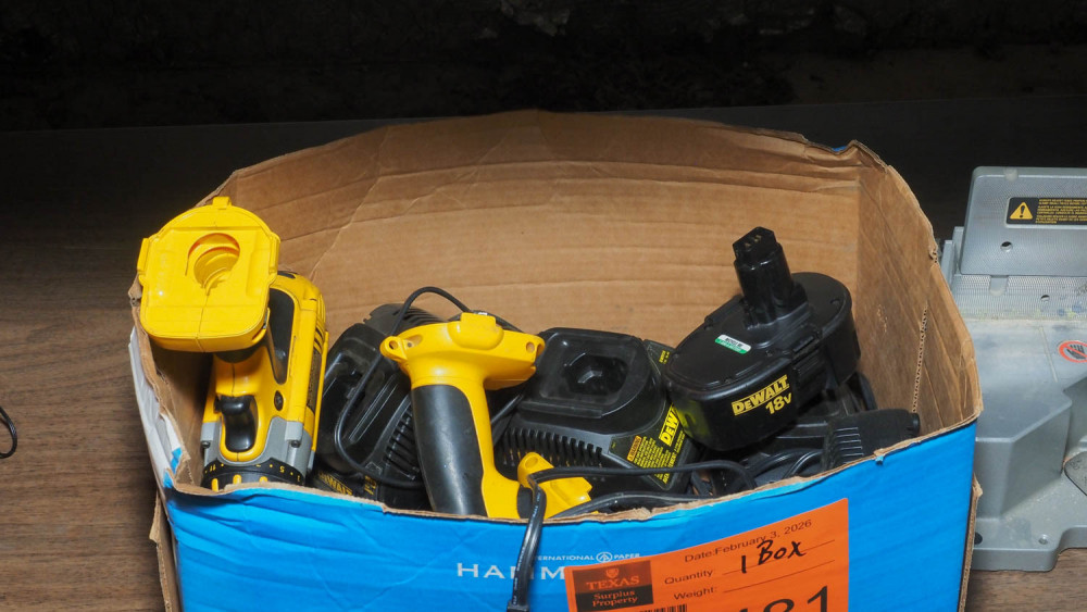 Includes: DC940, DW980, DW972 drills, (6) chargers, and (2) 18V batteries. Condition:Condition unknown. *The University of Texas at Austin makes no claim of physical or mechanical , and functionality of items available through SWICO Auctions. All items are sold “As is, where is”. It is the sole responsibility of the bidder to physically inspect items before bidding and assume all risk. Photos and descriptions are for preview only. All sales are final and no refunds will be issued. Please refer to the SWICO “Terms of Service” in which you have agreed to.