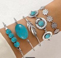 Fashion Retro Turquoise Inlaid Jewelry Set, Personality Versatile Ethnic Style Flower Feather Open Five-piece Set Great Deals and Steal