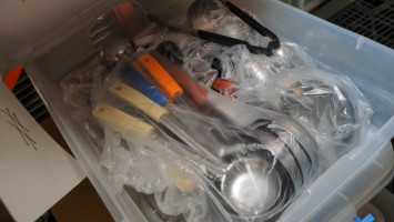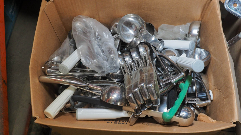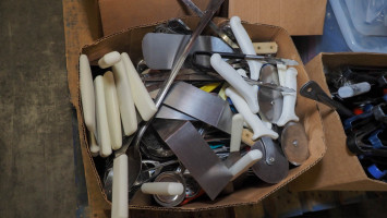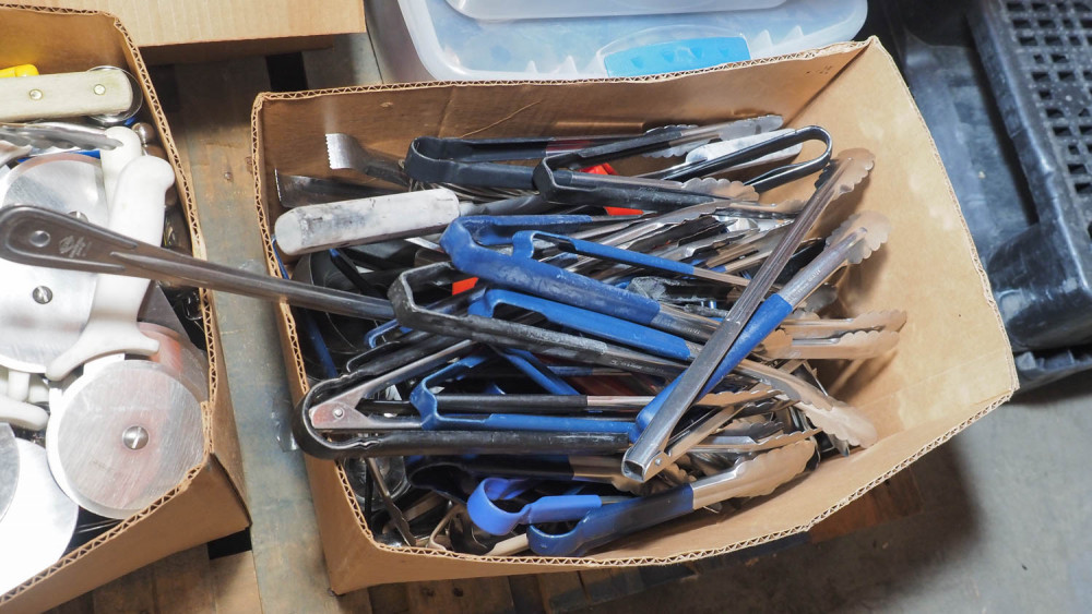 Approximately 500+ items. Includes: Spatulas, pizza cutters, scoops, tongs, spoons, strainers, and more. Condition: Used