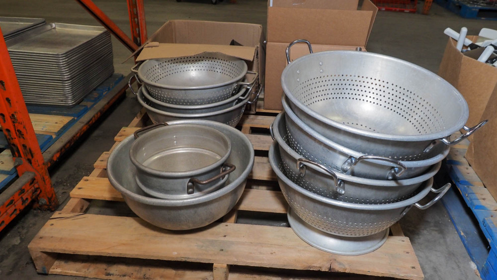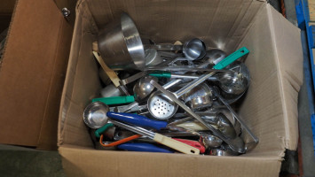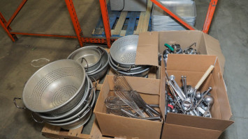 Approximately 200 items. Includes: Tongs, scoops, scrapers, and multiple large strainers (~14 inches across). Condition: Used