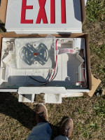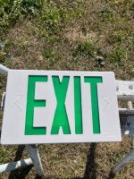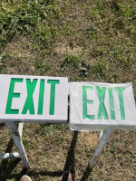 Lot of 4 lighted exit signs. Two red and two green. Comes with extra sign plate for single or double sided sign.