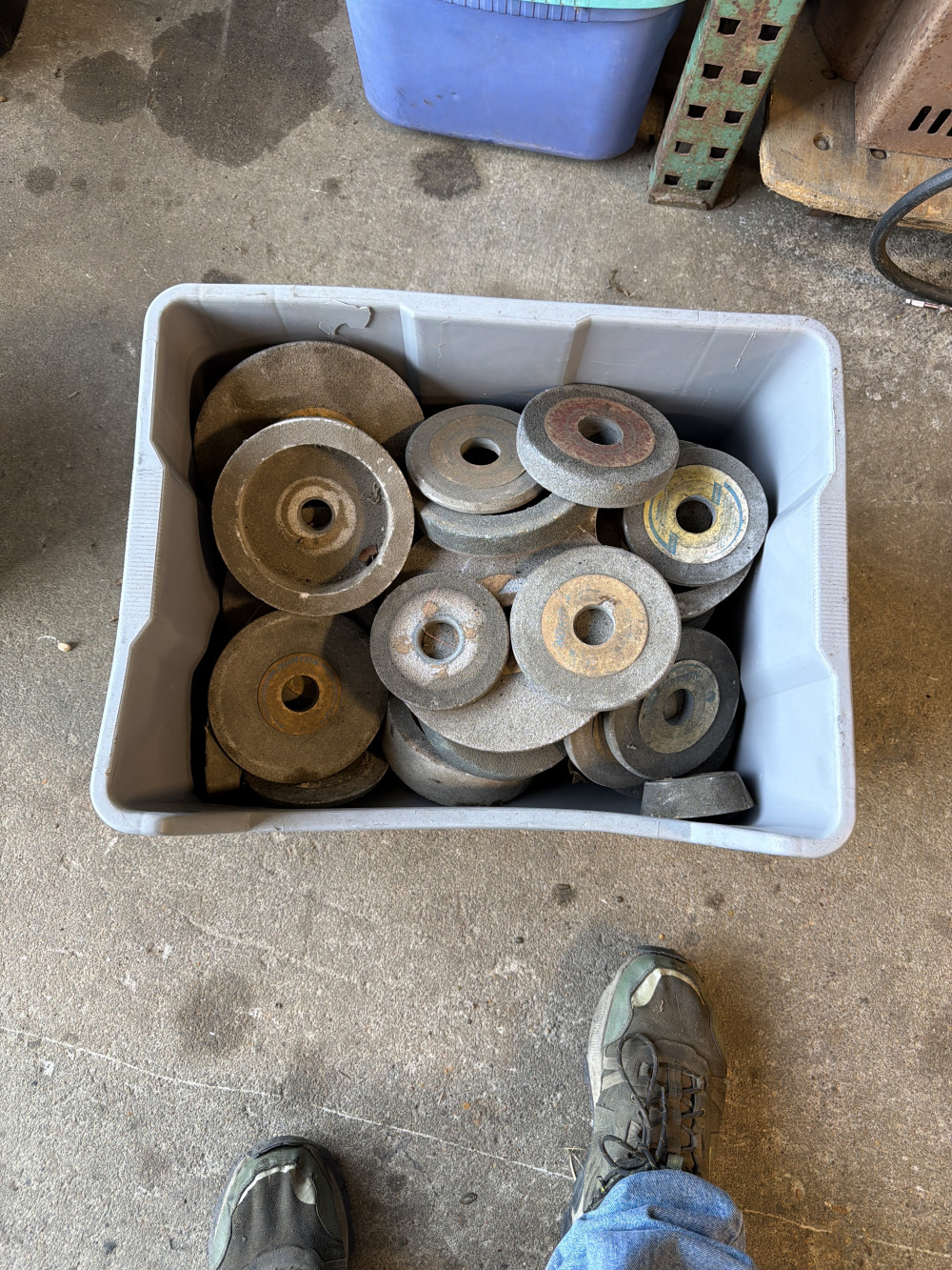 Large crate of grinding stones sharpening stones. I’m not sure really what they are describe the best I can. There’s probably a good one or 30 of them.