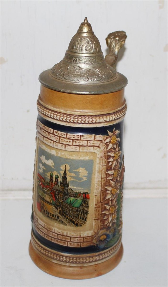 Vintage beer stein with pewter lid. "Gerz Munchen" with a relief scene of Marienplatz Great Deals and Steal