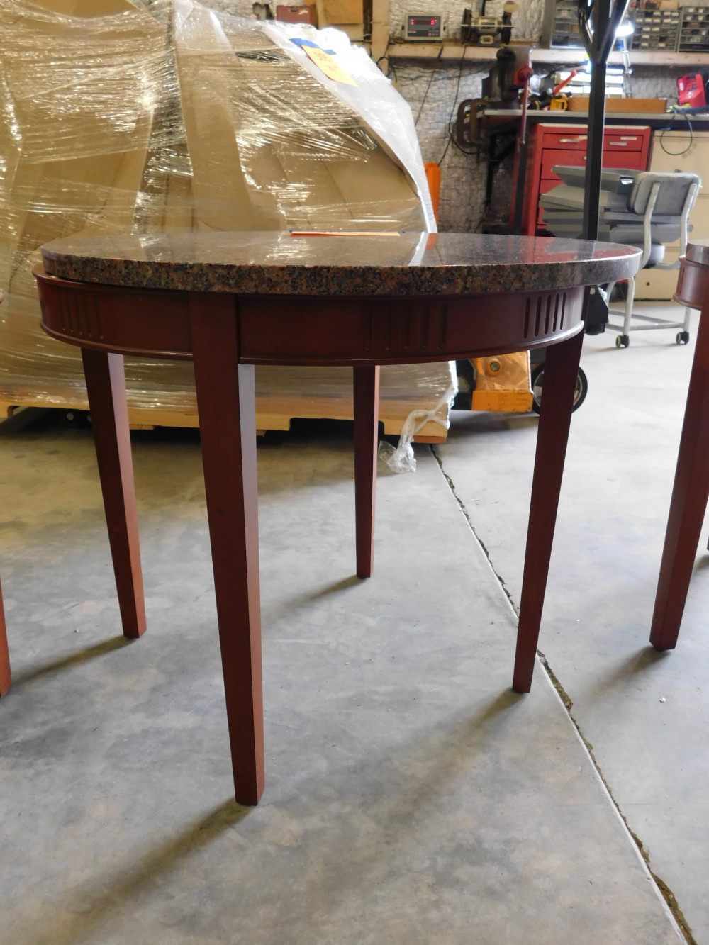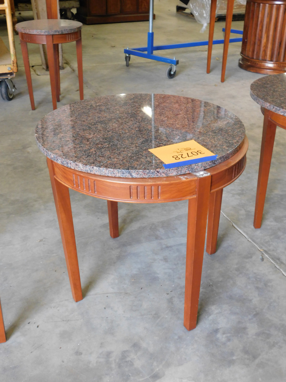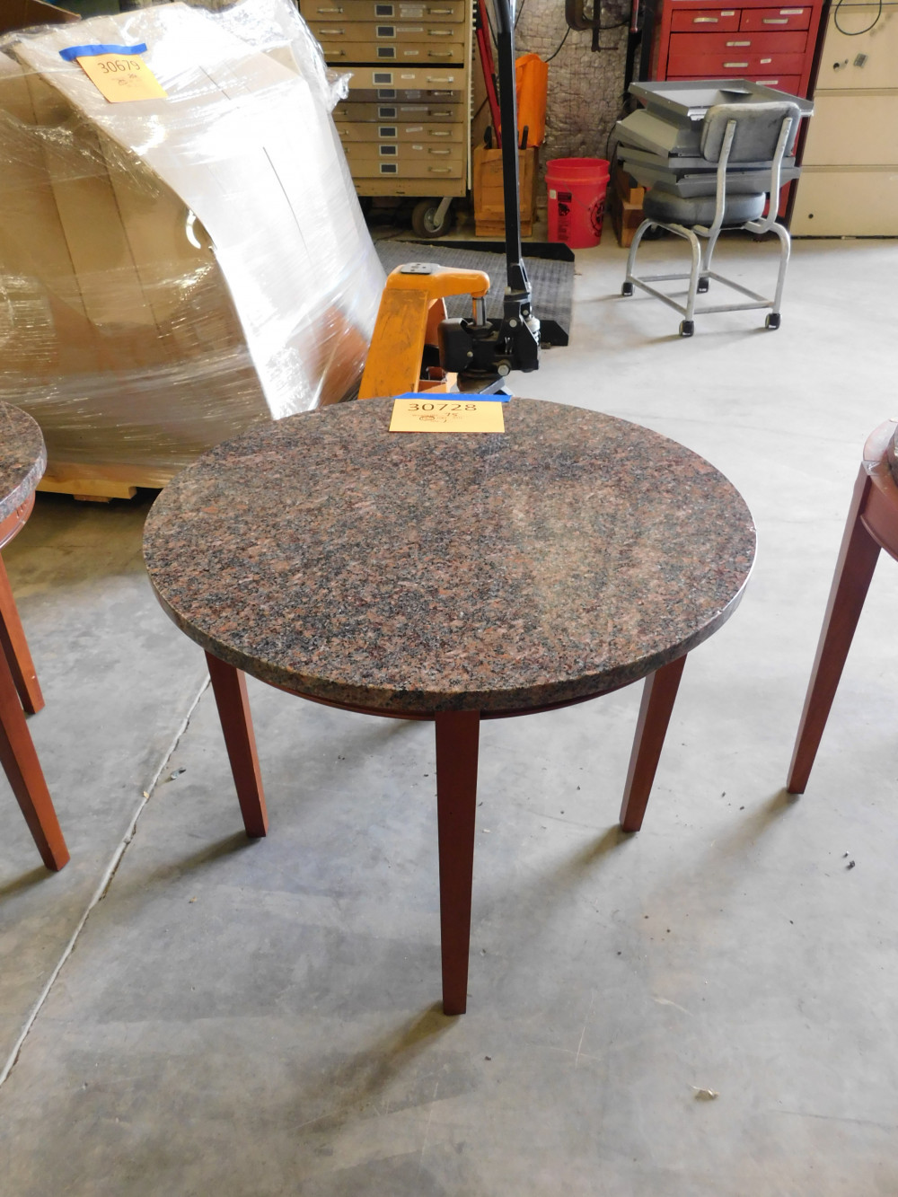 A circular granite coffee table with a custom wooden frame and a granite top. 24" diameter, 20" tall. Granite top is not mounted to base.