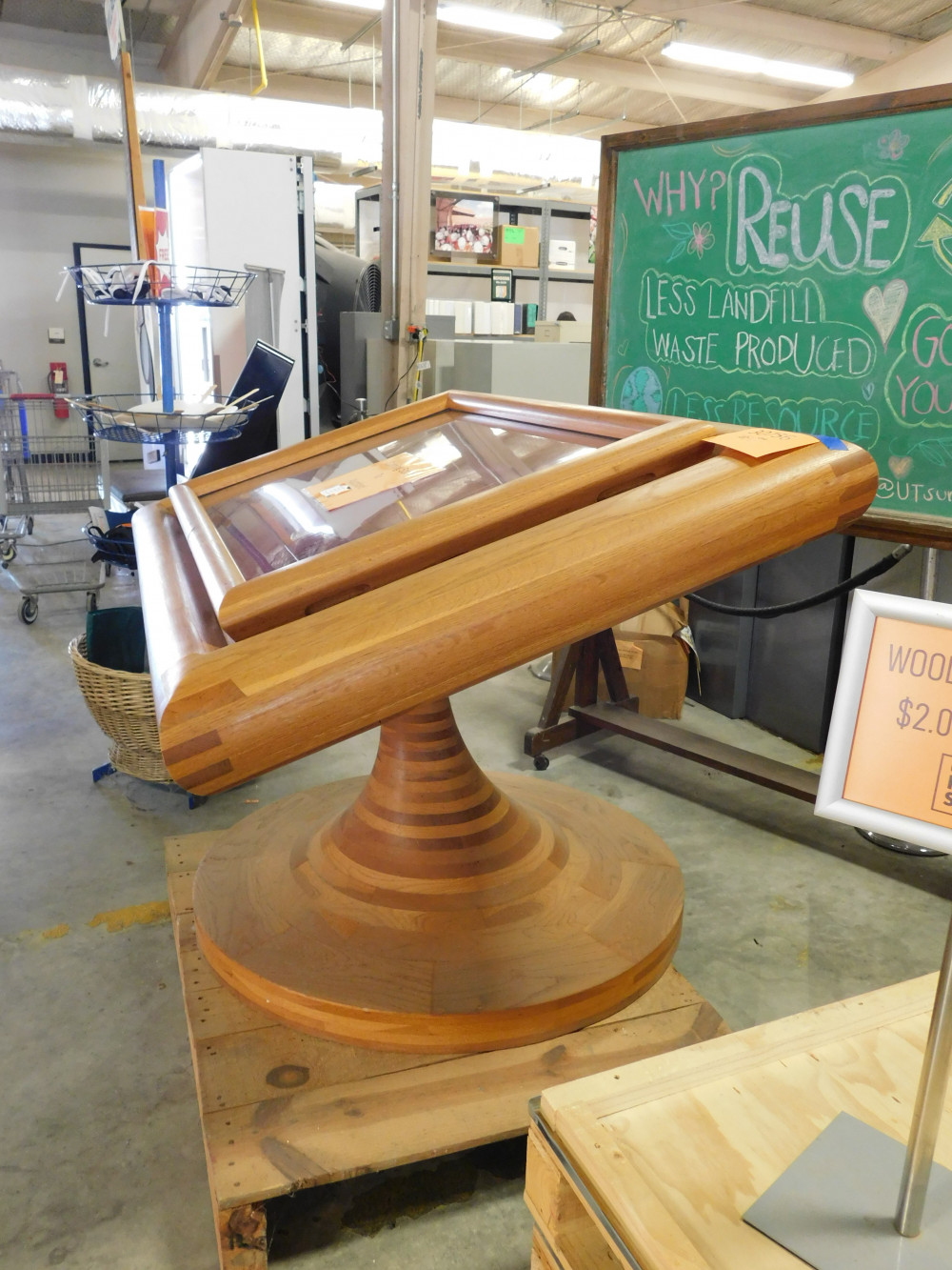 Large wooden display case. The front glass panel is removable for interior display access. Featuring a distinctive striped barrel-shaped base and a slanted top. General age related wear all around, some wood stress present. 64" long, 40" wide, 44" tall.