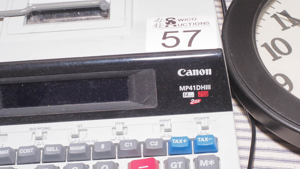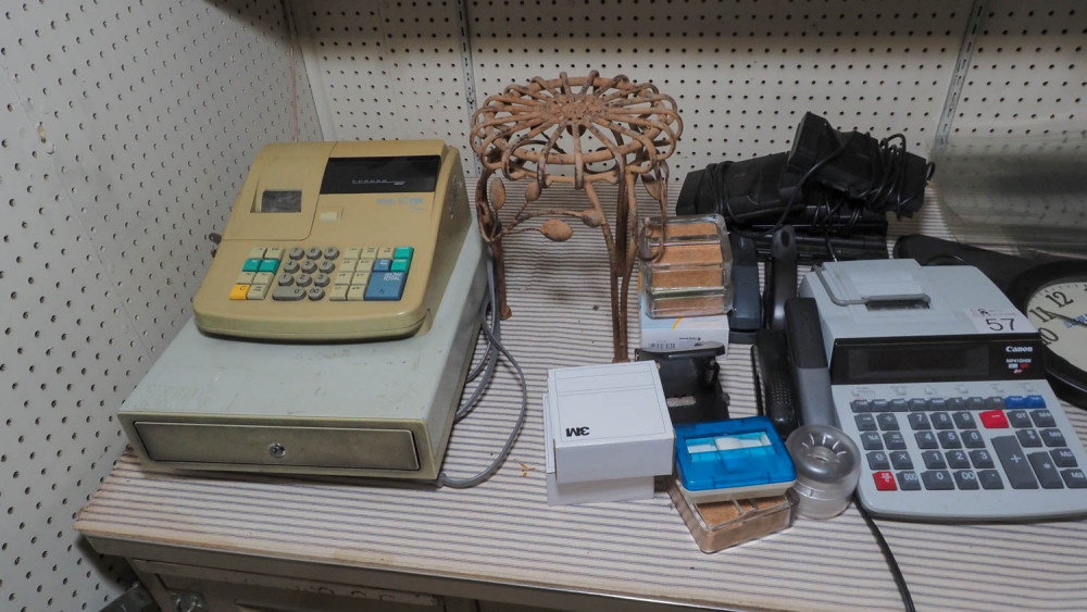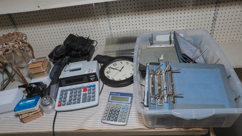 Binders, calculators, Clock, dicta phone, whole punch, royal 125 NX cash register
