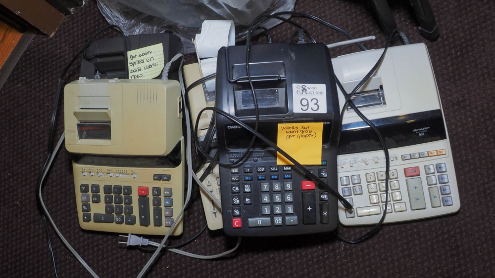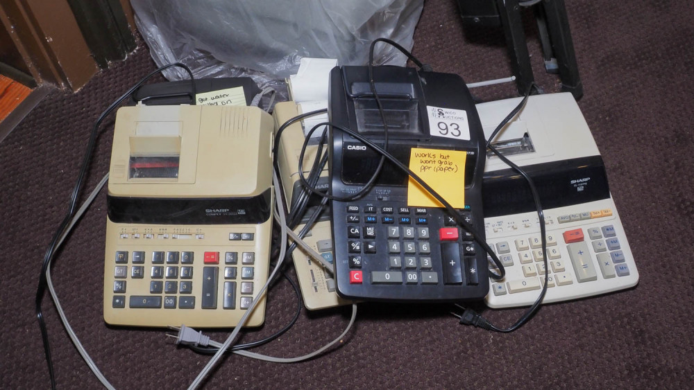 Sharp, Casio, Condition:1 marked not working, 1 works but won’t grab paper, others are unknown.