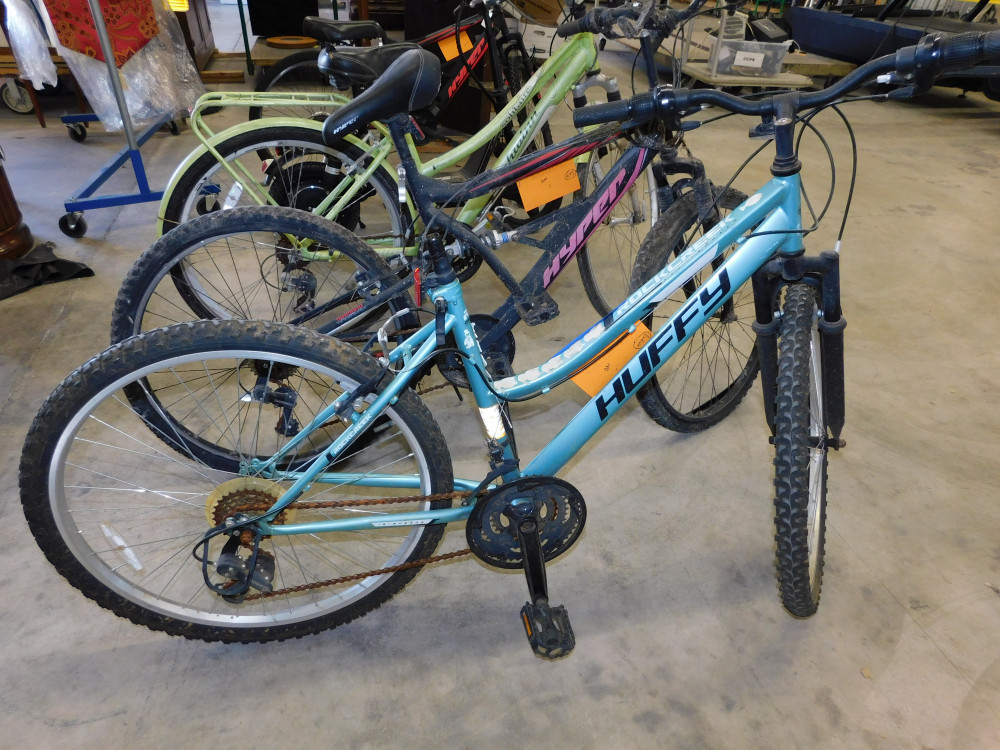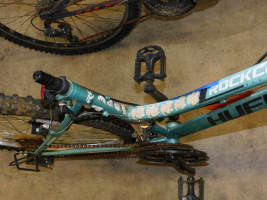Huffy Rock Creek 26" Mountain Bike. 18 speed. Missing seat, rusty chain, tires are full of air. Exterior paint is worn.