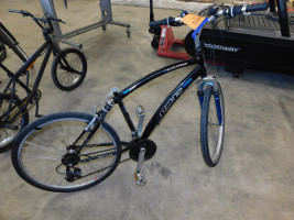 Ozone 500 Black Canyon Bike, 26" wheels, 7 speed. Missing seat, flat tires, slight surface rust.