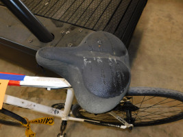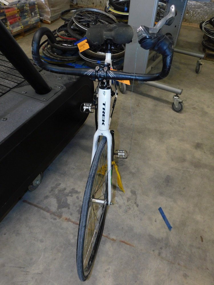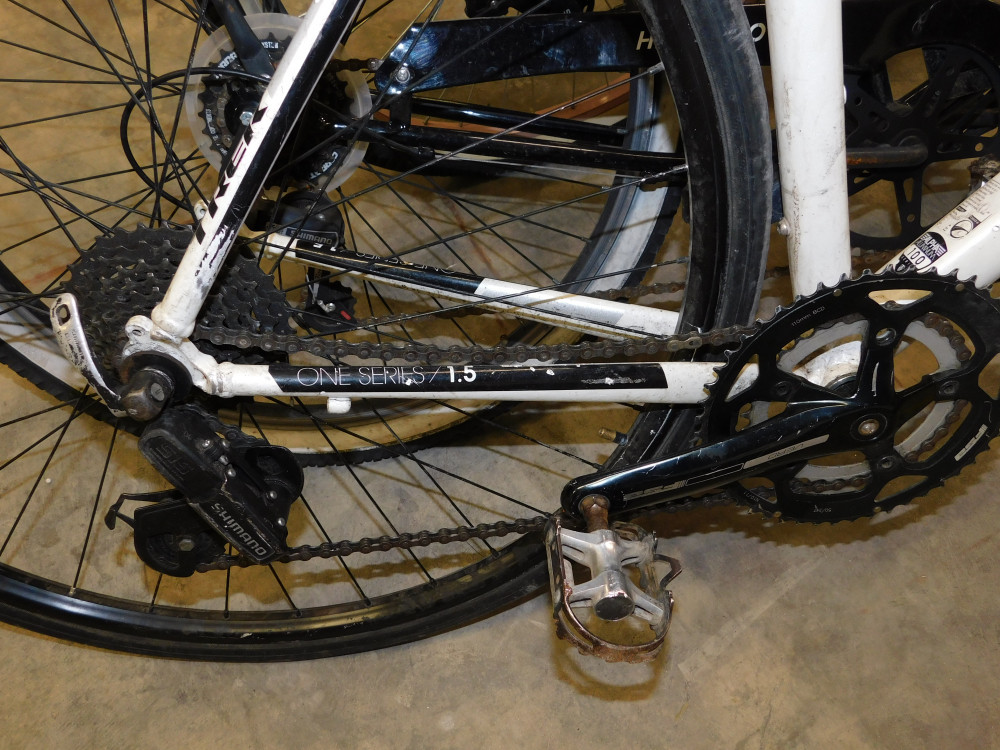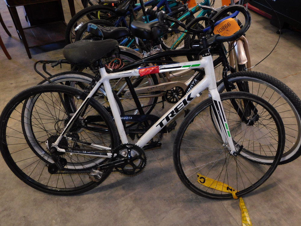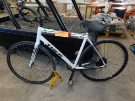 Trek Men's Hybrid Bike. 16 speed, front tire is flat, brake system inoperable, and seat is sticky. Has frame damage.