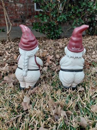 Pair of garden gnomes personalized for an Aggieland yard. The paint has been sun worn, but the figurines are in good shape with no cracks. 14".