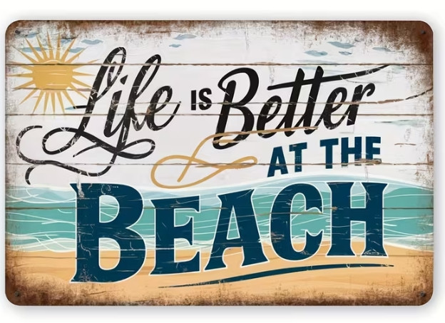 2D Flat, Restaurant Ambiance Vintage Life Is Better at The Beach Metal Sign Rustic Wall Art with Sun Waves Design 8x12 ***