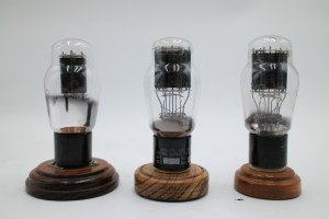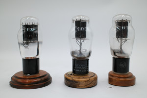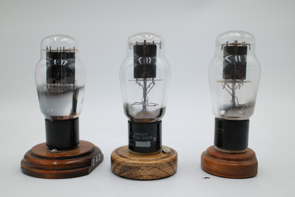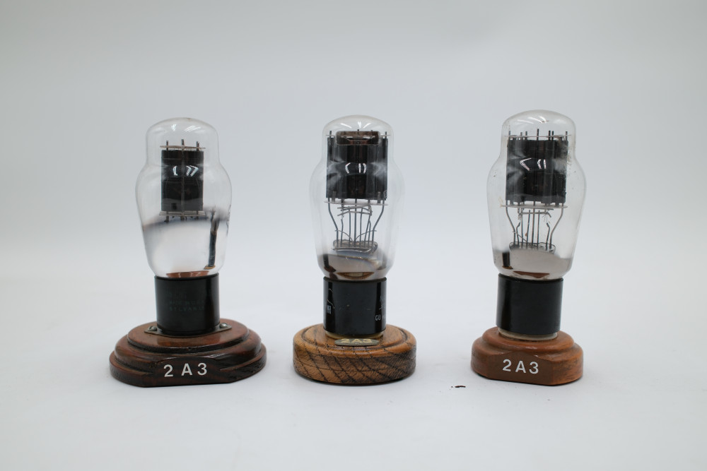 A set of three 2A3 Vacuum Tubes. One manufactured by National Union, one by RCA, and one by Sylvania. All mounted on individual wooden bases. Tubes are entirely untested and appear to be free of cracks in their glass. All tubes include their original collection sorting tags.