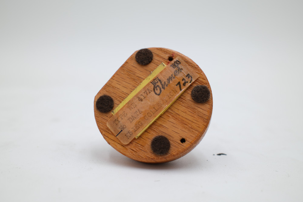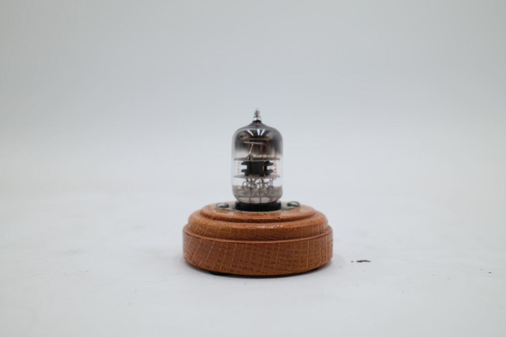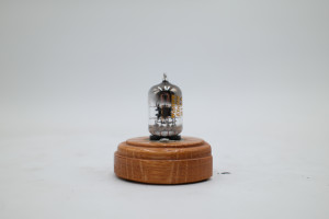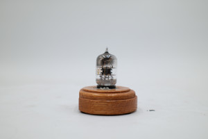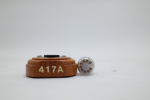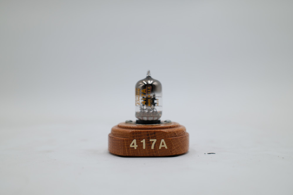 One Western Electric 417A miniature 9-pin vacuum tube mounted on wooden display base. Glass appears to be free of cracks, but the tube is entirely untested. Includes original collection sorting tag.