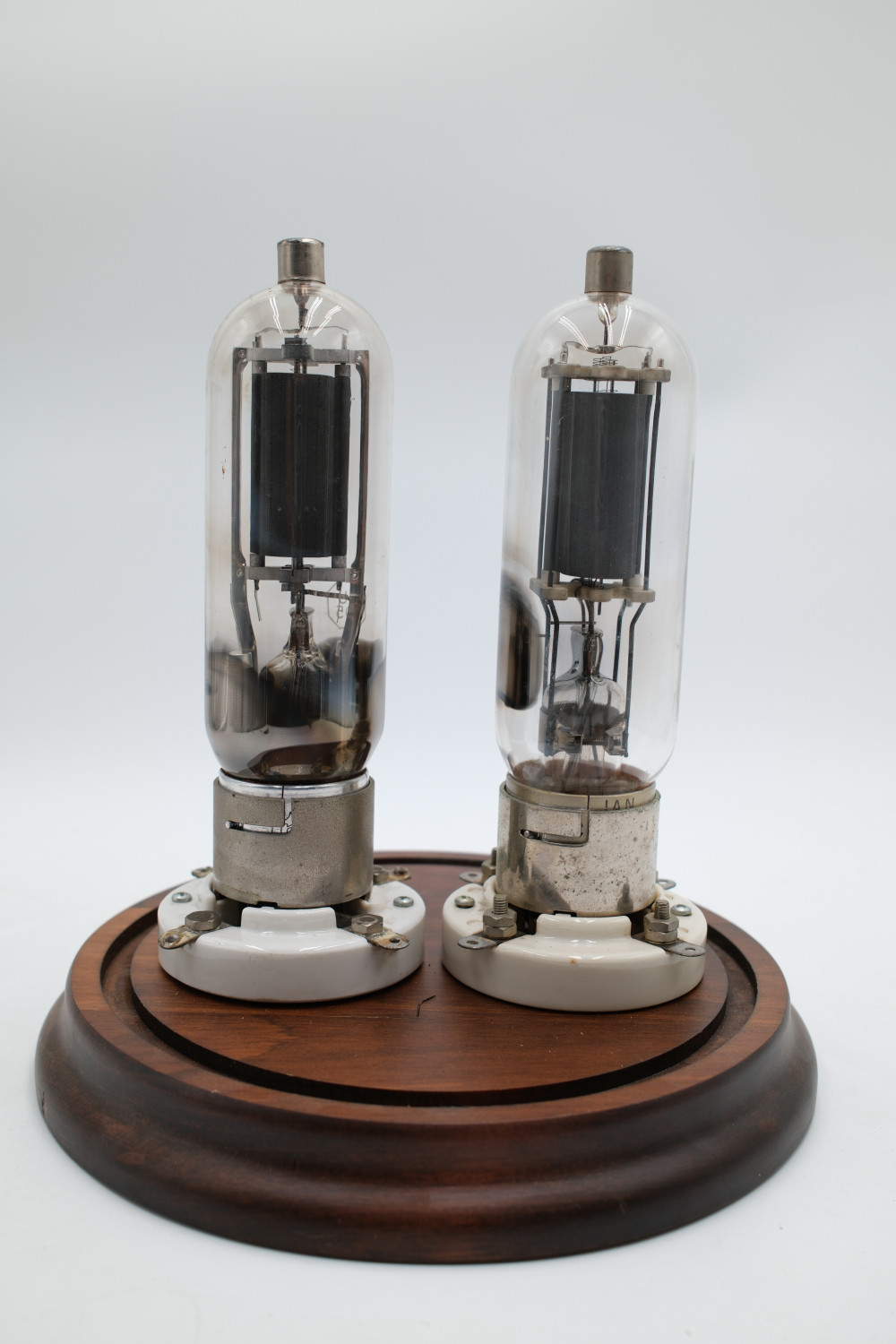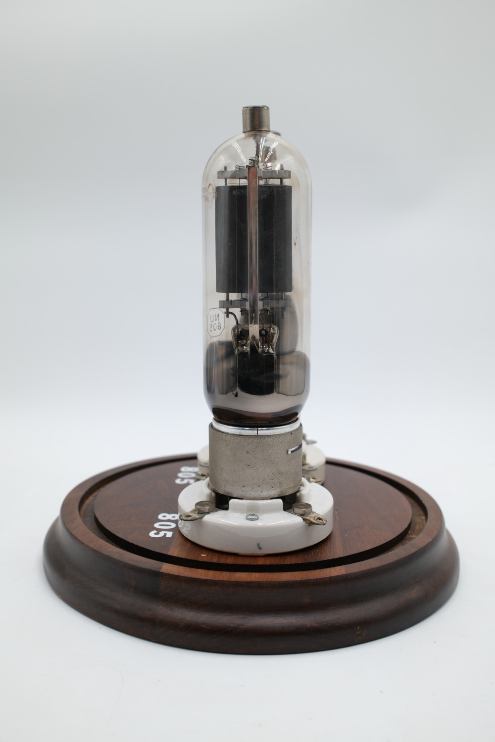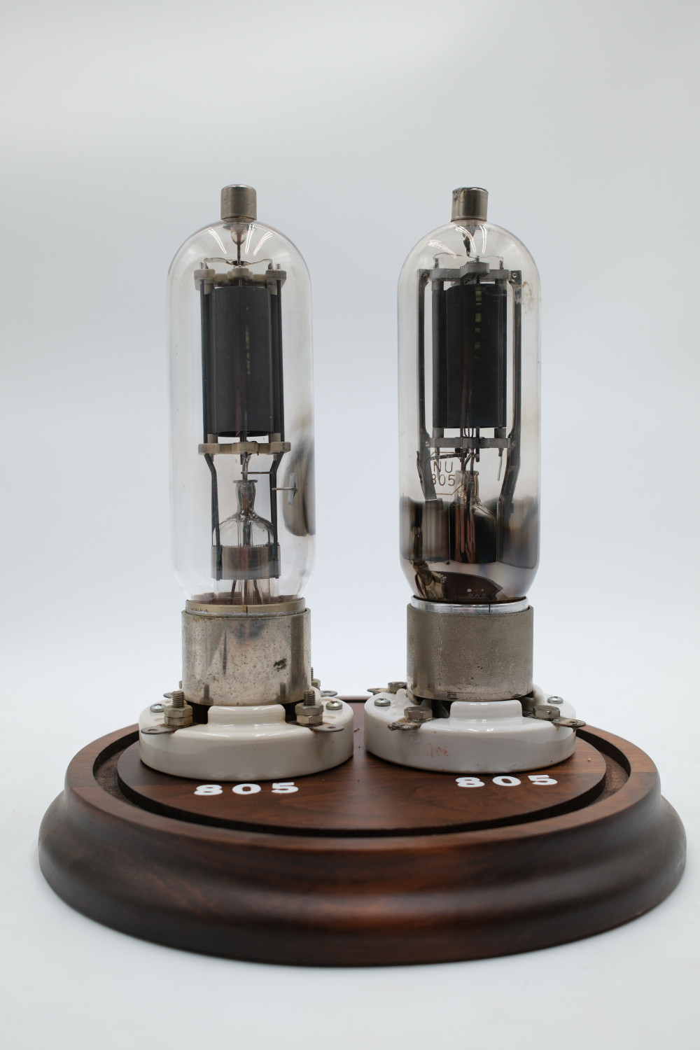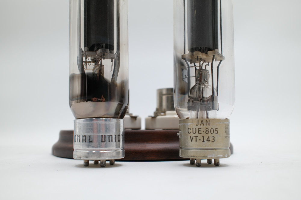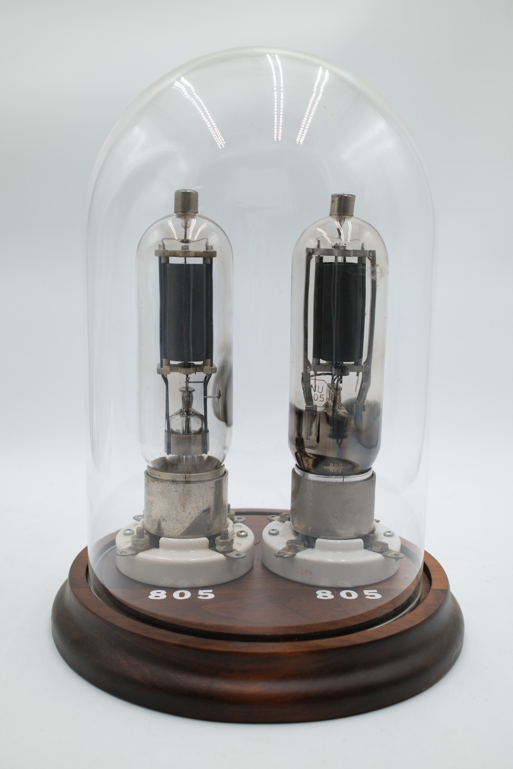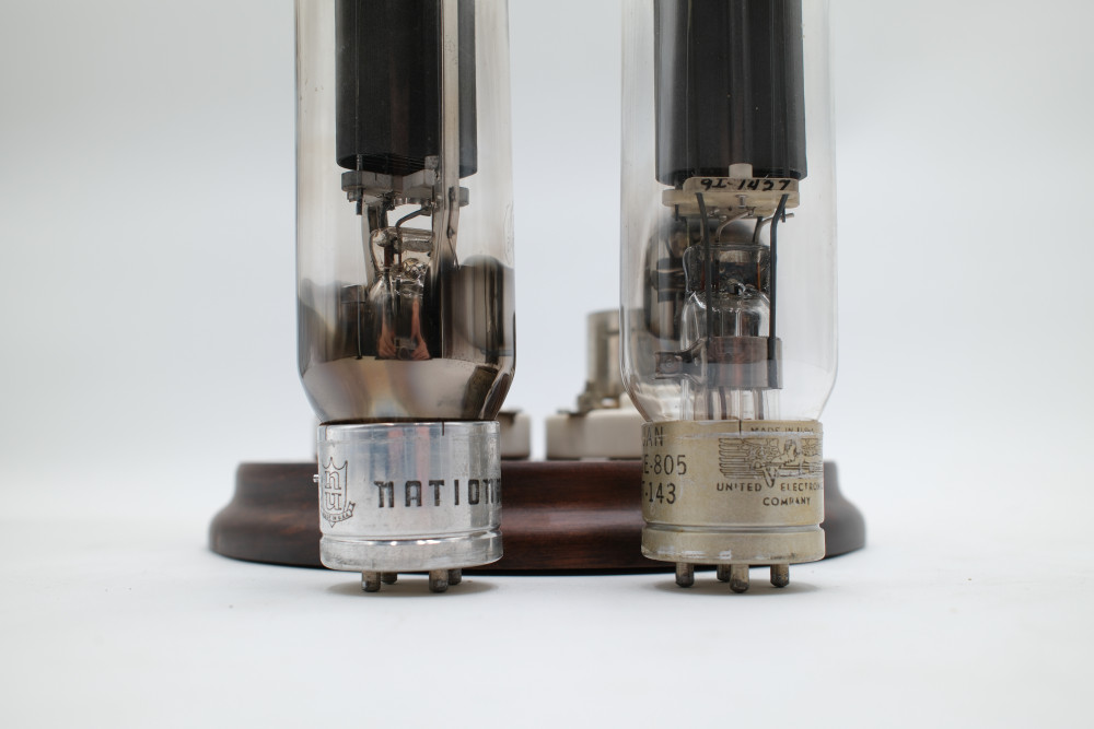 A set of two Model 805 Vacuum Tubes in a large glass display case. One made by United Electronics and one made by National Union. Tube glass appears to be free of cracks, but are untested. Display case glass also appears to be free of cracks. The wooden display base is in good condition with no obvious imperfections.