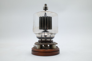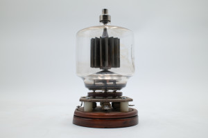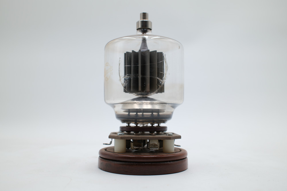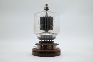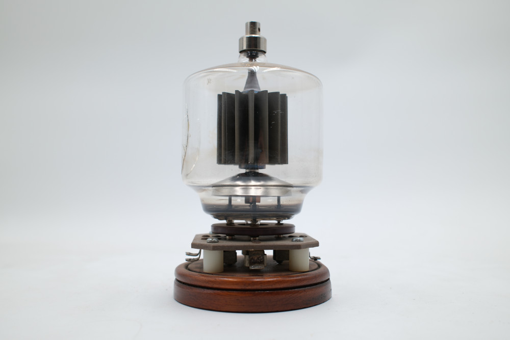 One Eimac 3-500Z Vacuum Tube mounted to a wooden display case. Glass has circular shaped damage to one side and the tube is untested in its entirety.