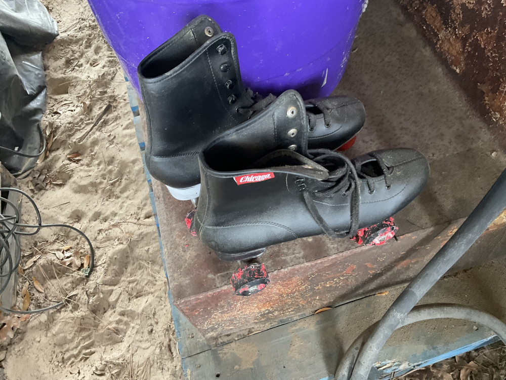 Chicago brand, attached leather lace up boots size 11 with stops. Boots and skates excellent condition, removable wheels need to be replaced, they are readily available online.