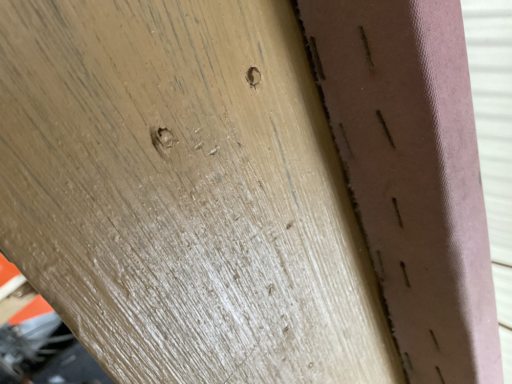 Two wooden tables with tops covered by fake leather. One is 35”x35”x27”tall. The other is 22”x36”x29”tall. Some deterioration on a few of the legs.