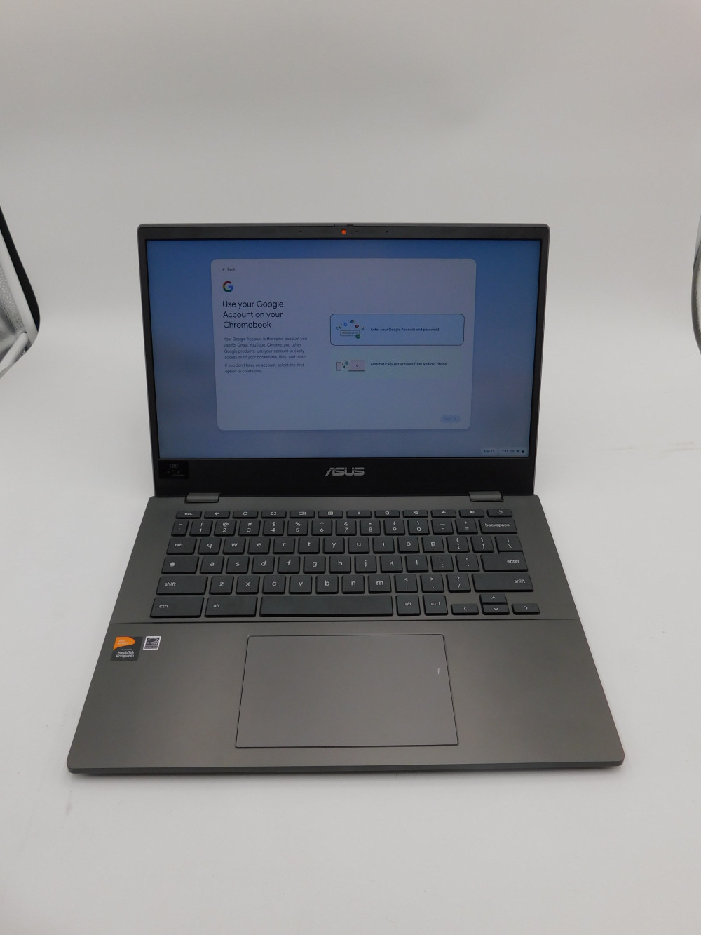 Asus Chromebook CM1402CM2. Comes with original box. Chromebook charges and powers on to account creation/log-in page. Otherwise fully untested.