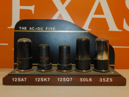 "The AC/DC Five" Vacuum Tube Display Set. Comprised of the following five tubes on a custom display mount. 12SA7, 12SK7, 12SQ7, 50L6, 35Z5.