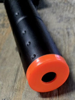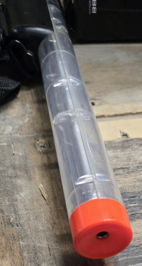 Airsoft/BB-style replica 6mm rifle with an orange muzzle tip and a shoulder stock; plastic spring-powered rifles; <2LBS