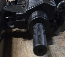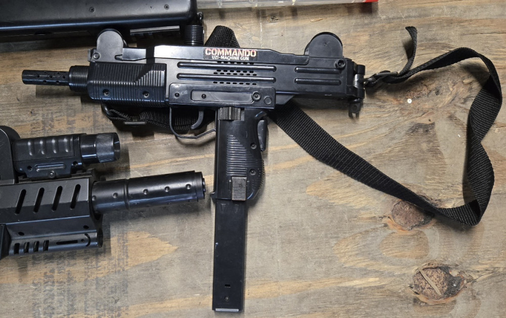*Airsoft/BB-style replica UZI SMG machine gun with a shoulder strap; extended magazine; airsoft/BB type; <3 lb