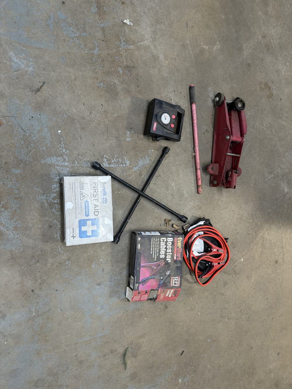 Vehicle accessories, floor Jack air pump four-way booster cables and a first aid kit