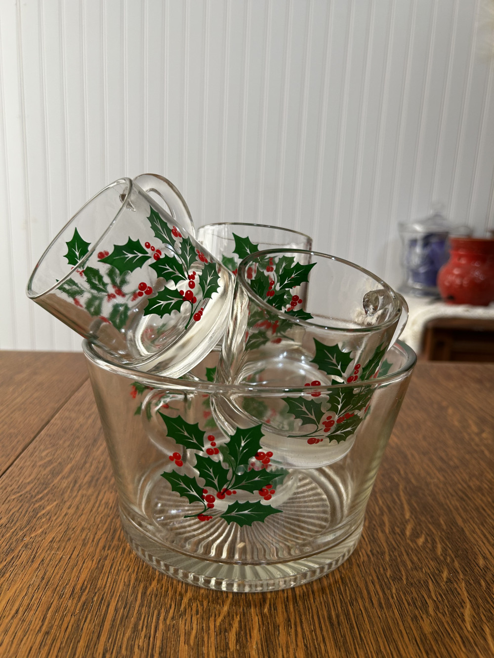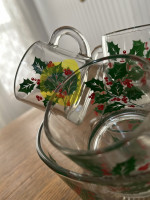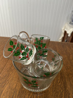 Vintage Christmas eggnog set. One small, very small chip on one of the cups. I’ve circled it in yellow highlight in the last photo. It could probably be buffed out.