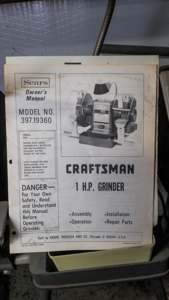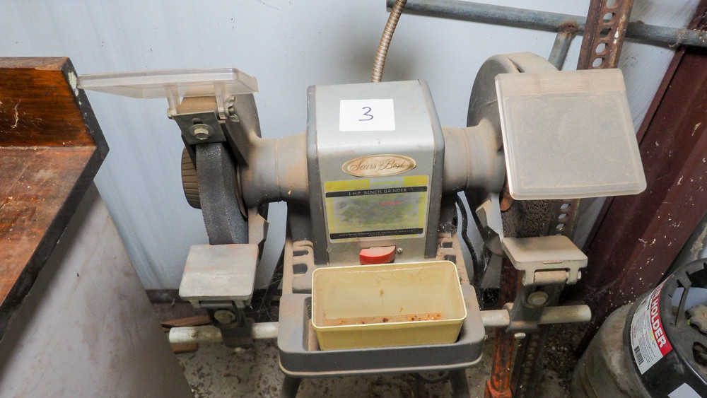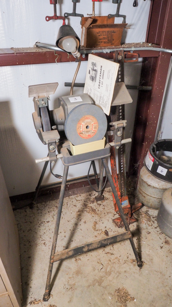1 horsepower, 8 inch discs, includes stand, wire wheel and grinding stone, includes extra grinding stone. Condition:Comes on