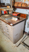 Measures 40 by 24 by 36 inch deck height, includes 12 drawer metal cabinet and solid wood top, contents not included.