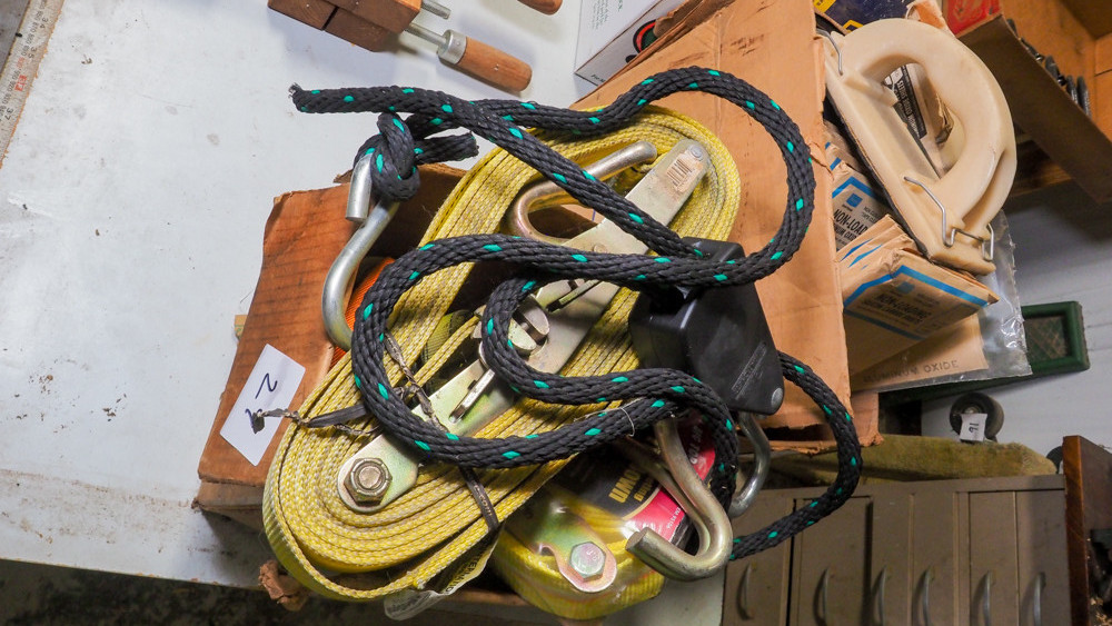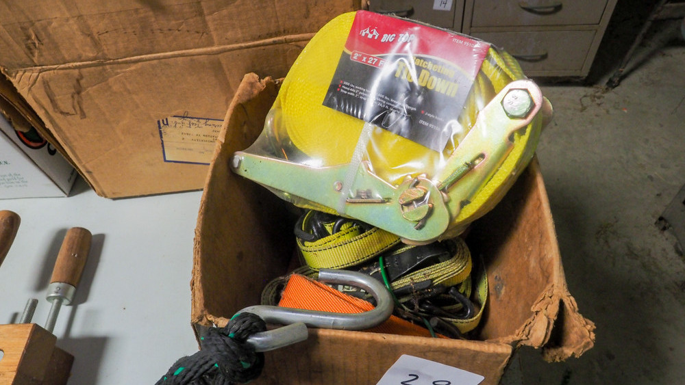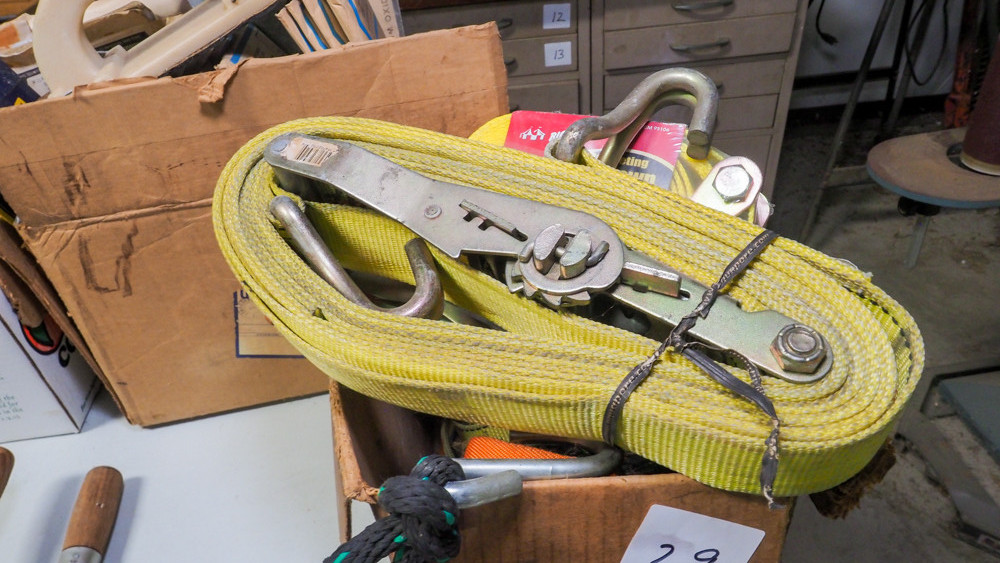 Box of ratchet straps, includes 1 inch and 2 inch straps plus rope winch.