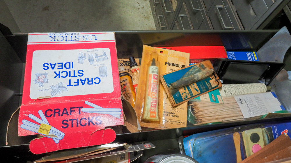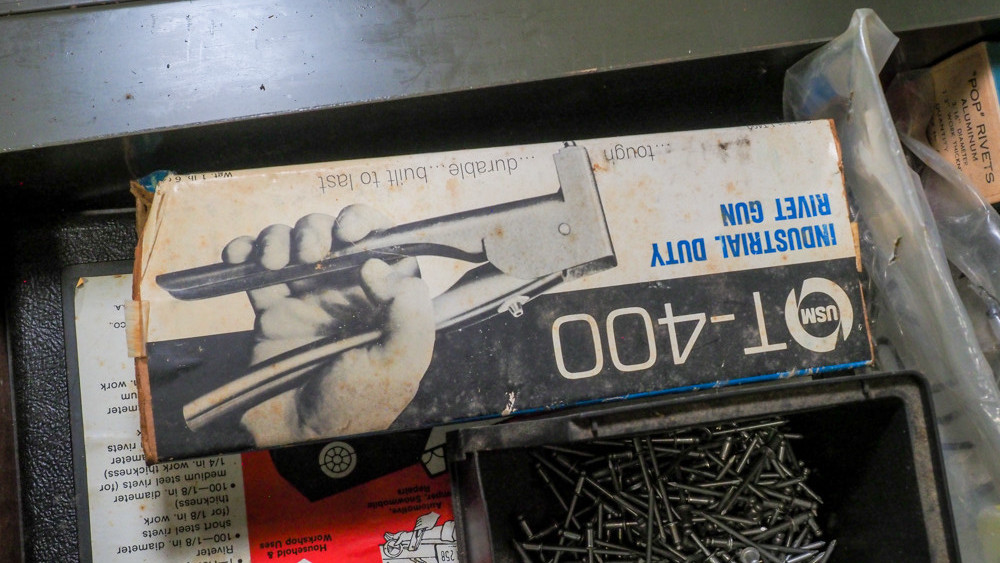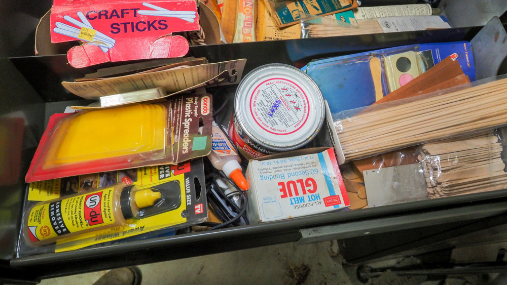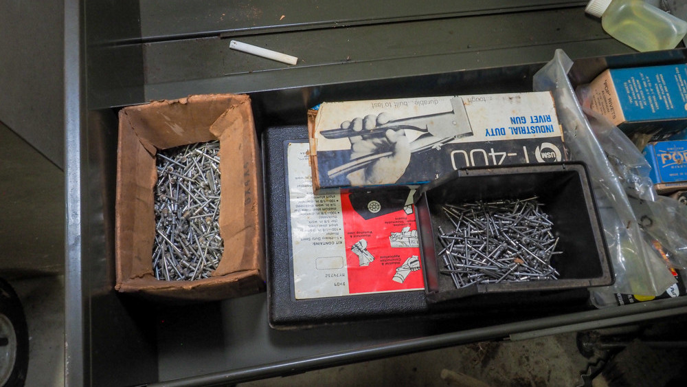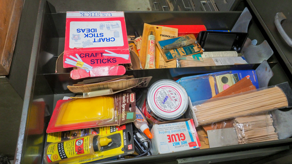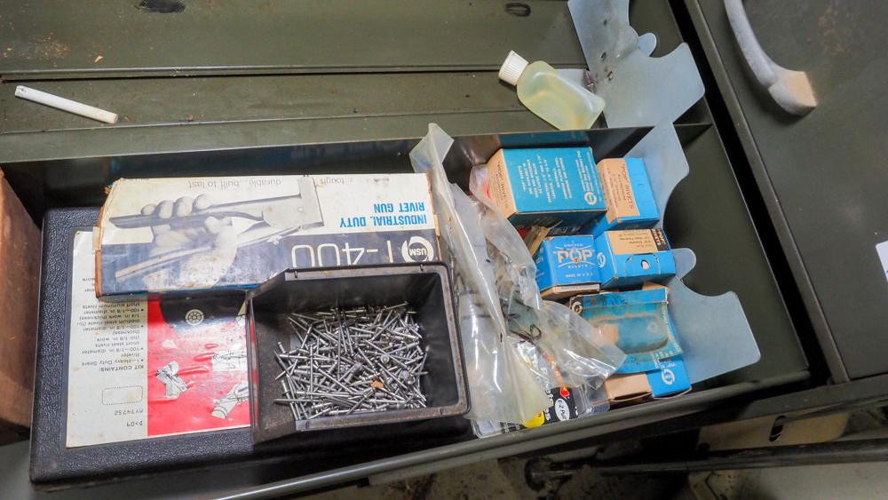 Drawer includes glue sticks, adhesive remover, spreaders, contact cement, and more. Second drawer has rivet guns and rivets.