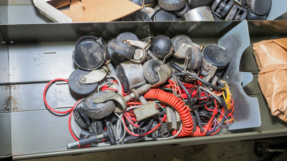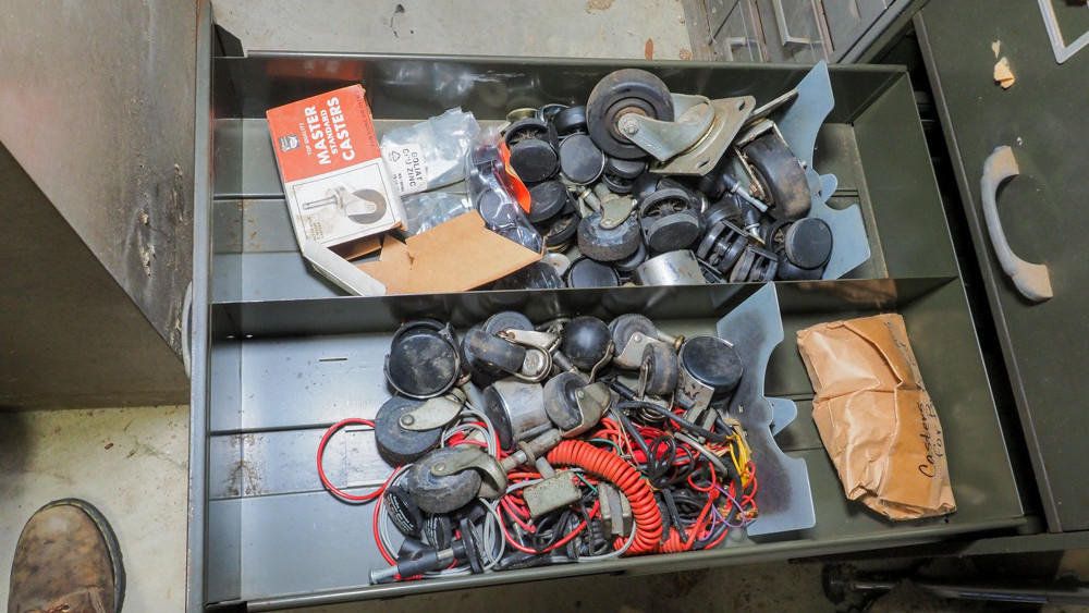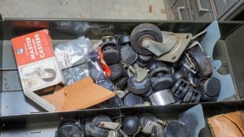 Drawer of chair casters of various sizes.
