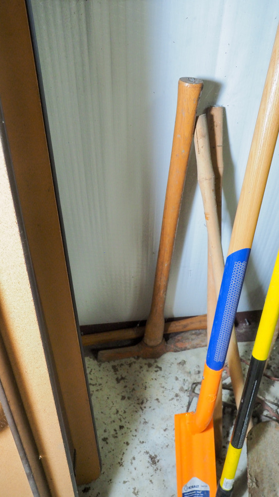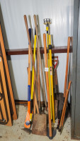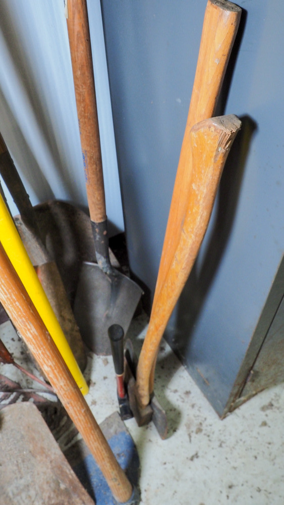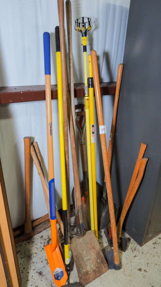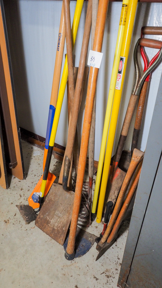 18 yard tools including flat point shovels, digging shovels, trench shovels, scoops, steel rakes, axes, hoes, pickaxe, and light bulb changer.