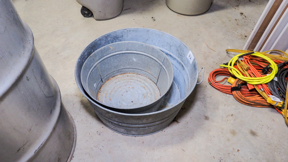 2 Galvanized wash tubs. (#86) Construction Equipment & Tools Estate Auction Shop Equipment