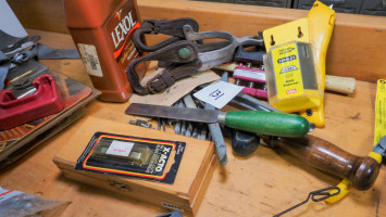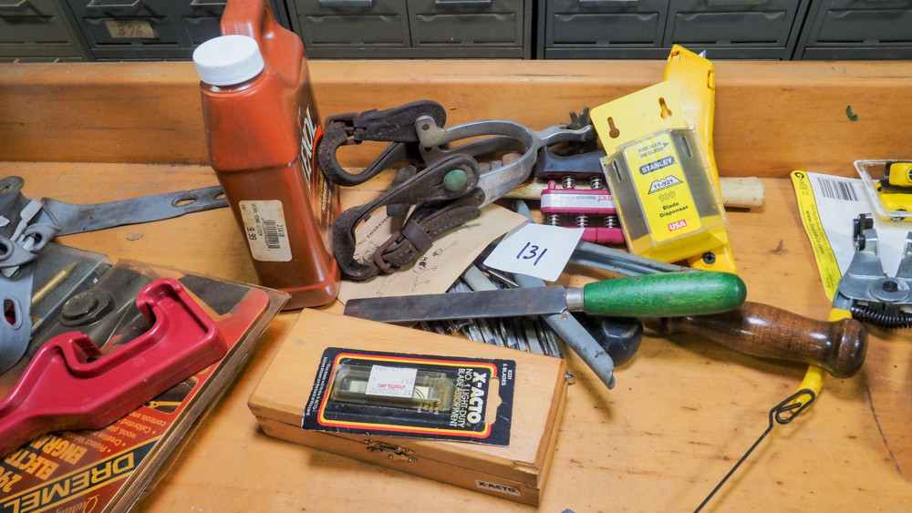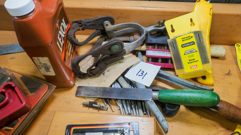 Includes exacto blades, knives, heel knives, stamps, hole punches, spurs, leather conditioner, ferrier hammer