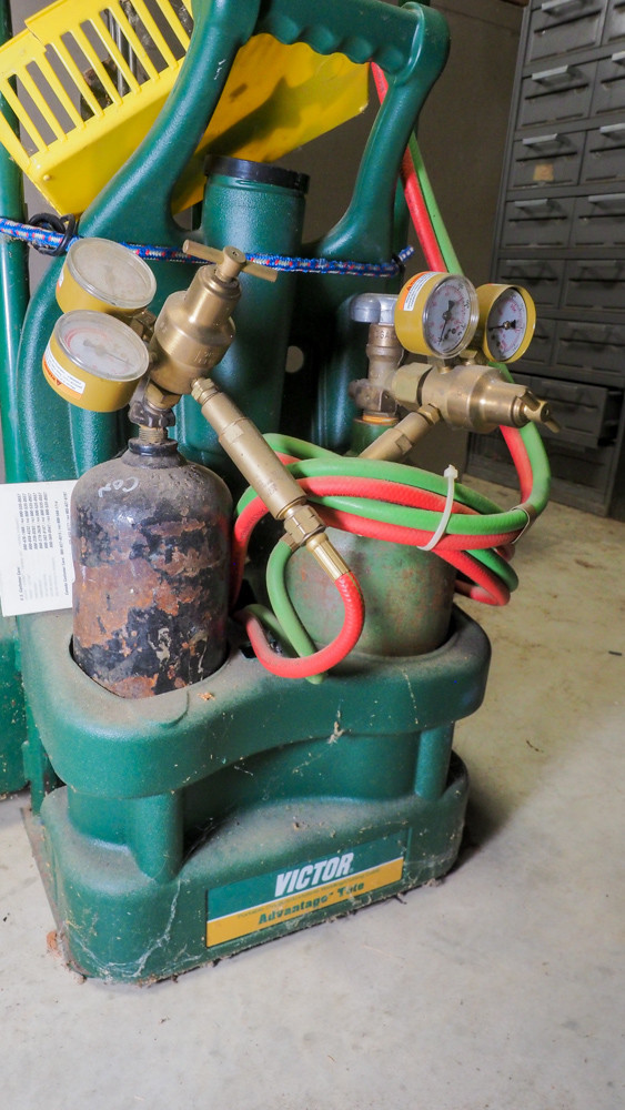 Includes bottles, regulators, torch, striker, chipping hammer, bottle wrench, pneumatic tire dolly