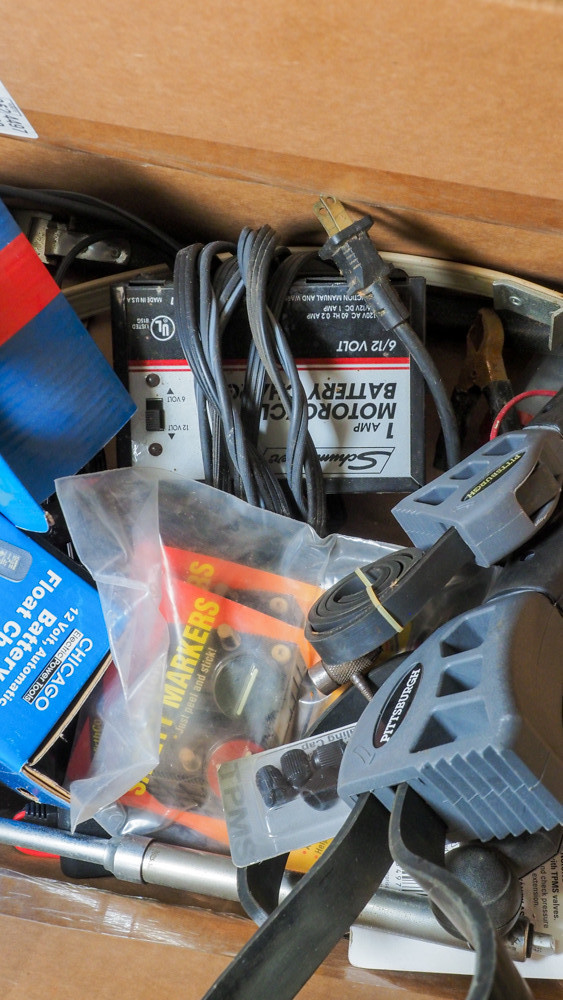 Includes storage trays, mirrors, valve caps, chargers, strap wrench, and more