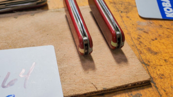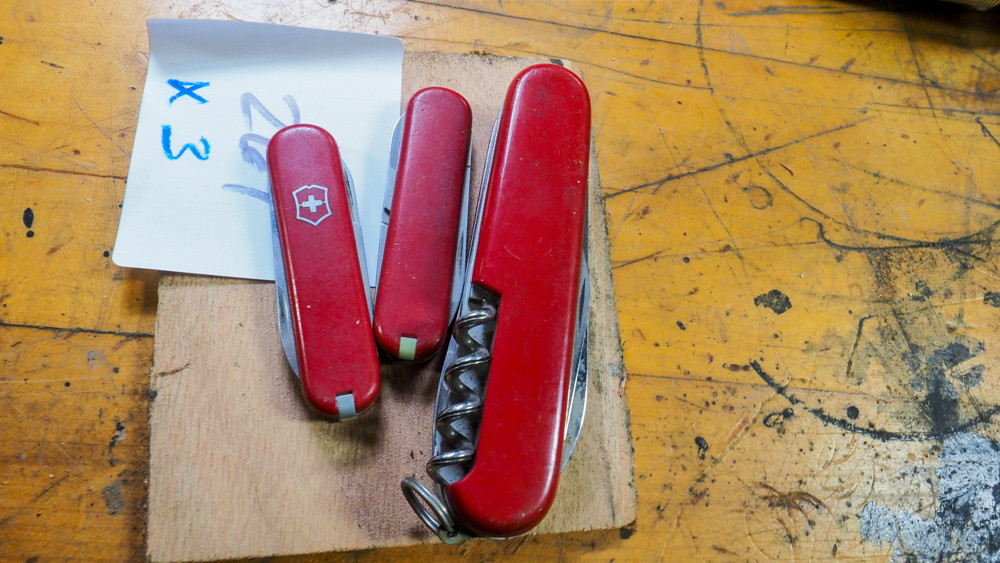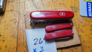 Three Victorinox Swiss Army knives. The two small knives have both the pick and tweezers.