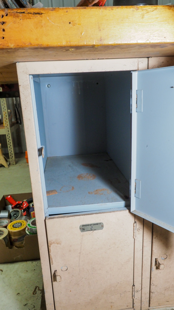 Square rolling shop bench (54 x 64 x 41 inches). Has three end vices attached. Includes two 6-gang locker sections in the bottom. Contents not included.