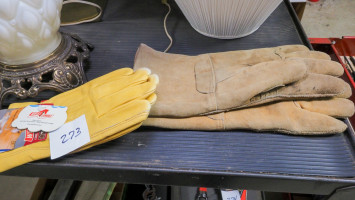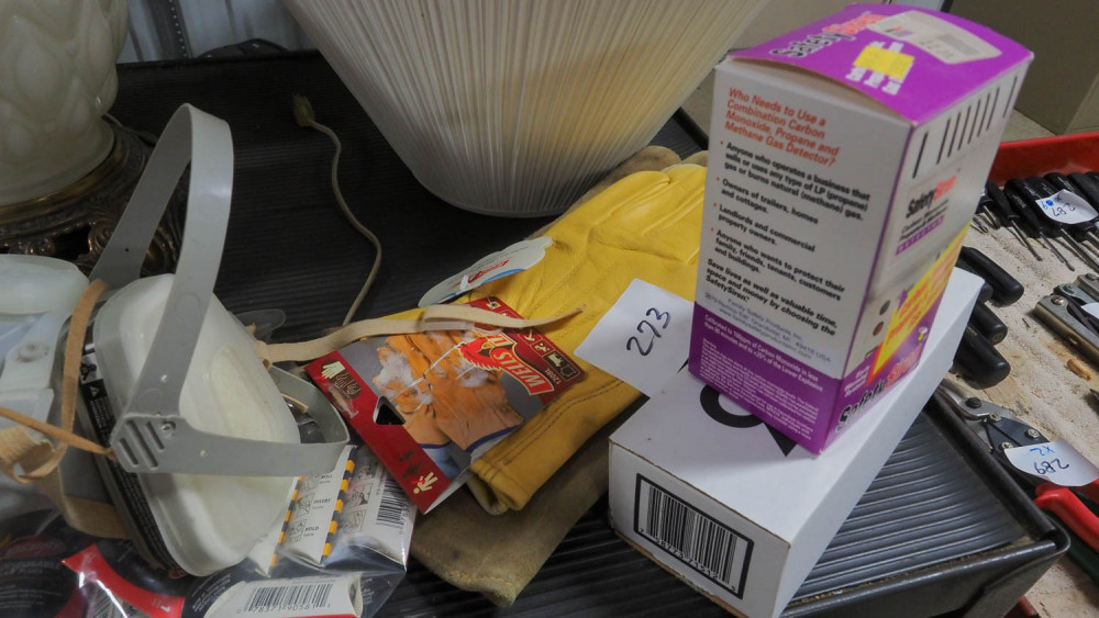 Two leather work gloves and one set of welding gloves, face masks, and alarms