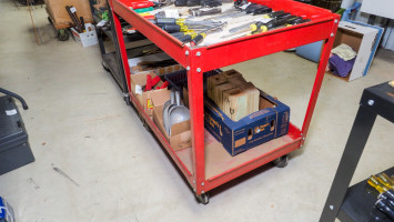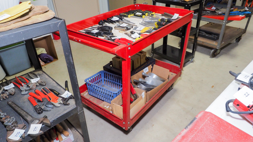 Red shop cart (24.5 x 36.5 x 33 inches).