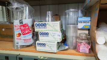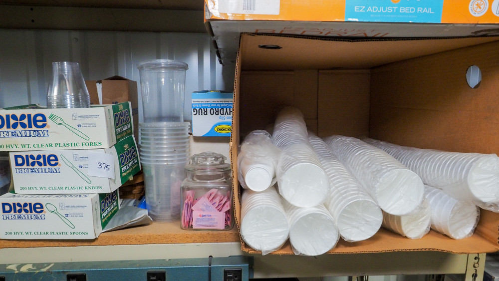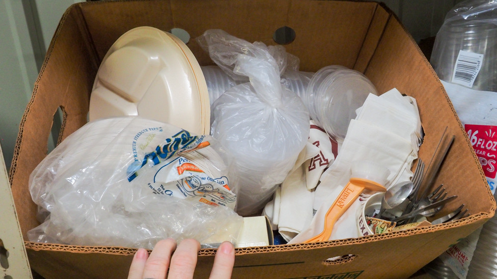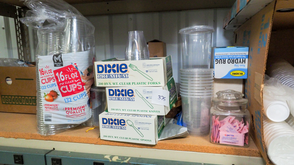 Includes plastic cups, forks, knives, spoons, to-go cups, straws, and styrofoam 12-ounce cups